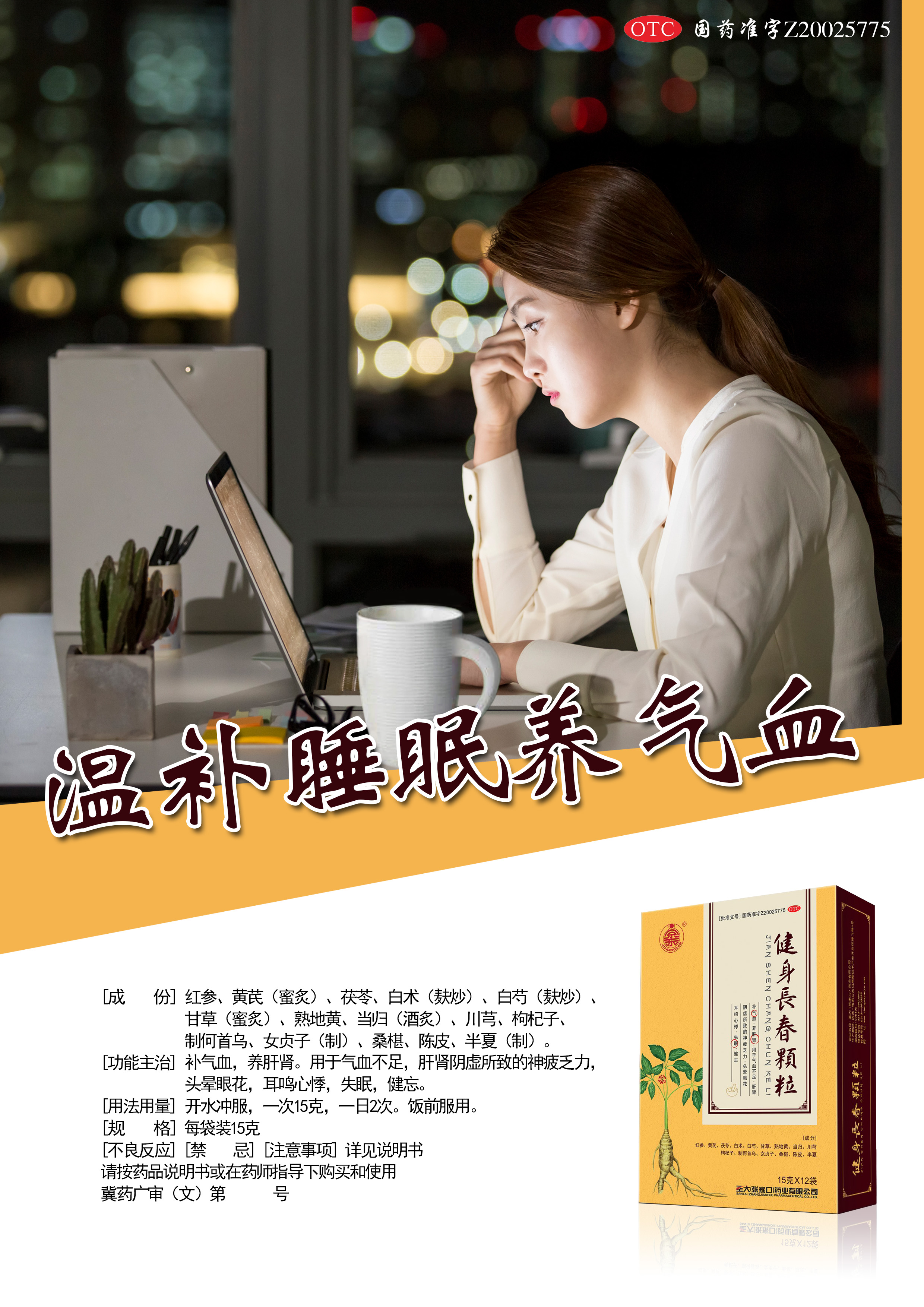 健身長(cháng)春顆粒以“溫補睡眠養氣血”、“調脾胃補五臟固先天”為基本醫理,其直接療效為 “提高深睡眠中的生血能力”以及“調節脾胃化生以補五臟補后天固先天”,最終達到“補氣血、養肝腎”的最終目標。同時(shí)該產(chǎn)品一改“中藥起效慢”的缺點(diǎn),具有療效明顯而迅速、不良反應小、可長(cháng)期服用等顯著(zhù)優(yōu)勢。